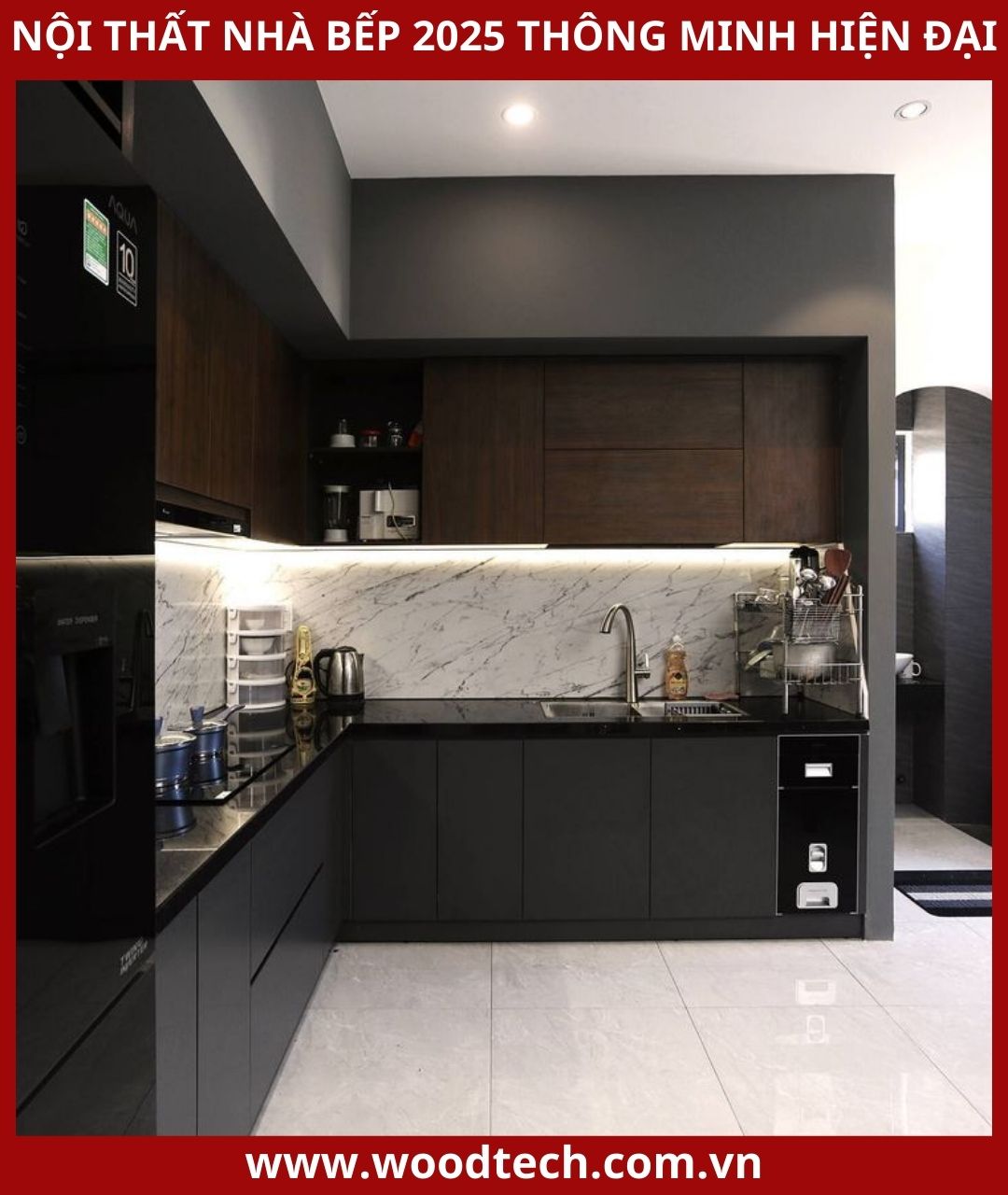 - Màu đen – trắng tối giản phù hợp với phong cách bếp hiện đại, sang trọng.